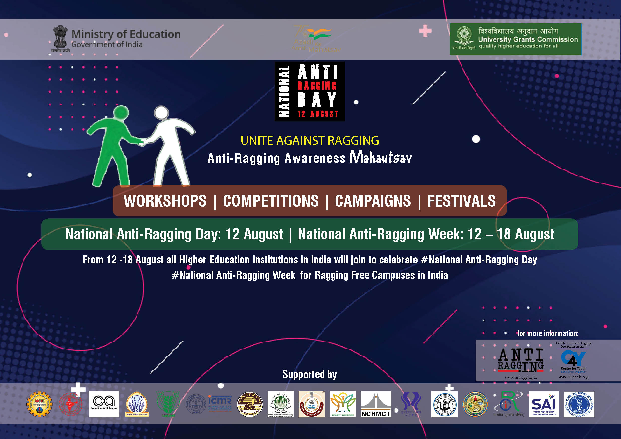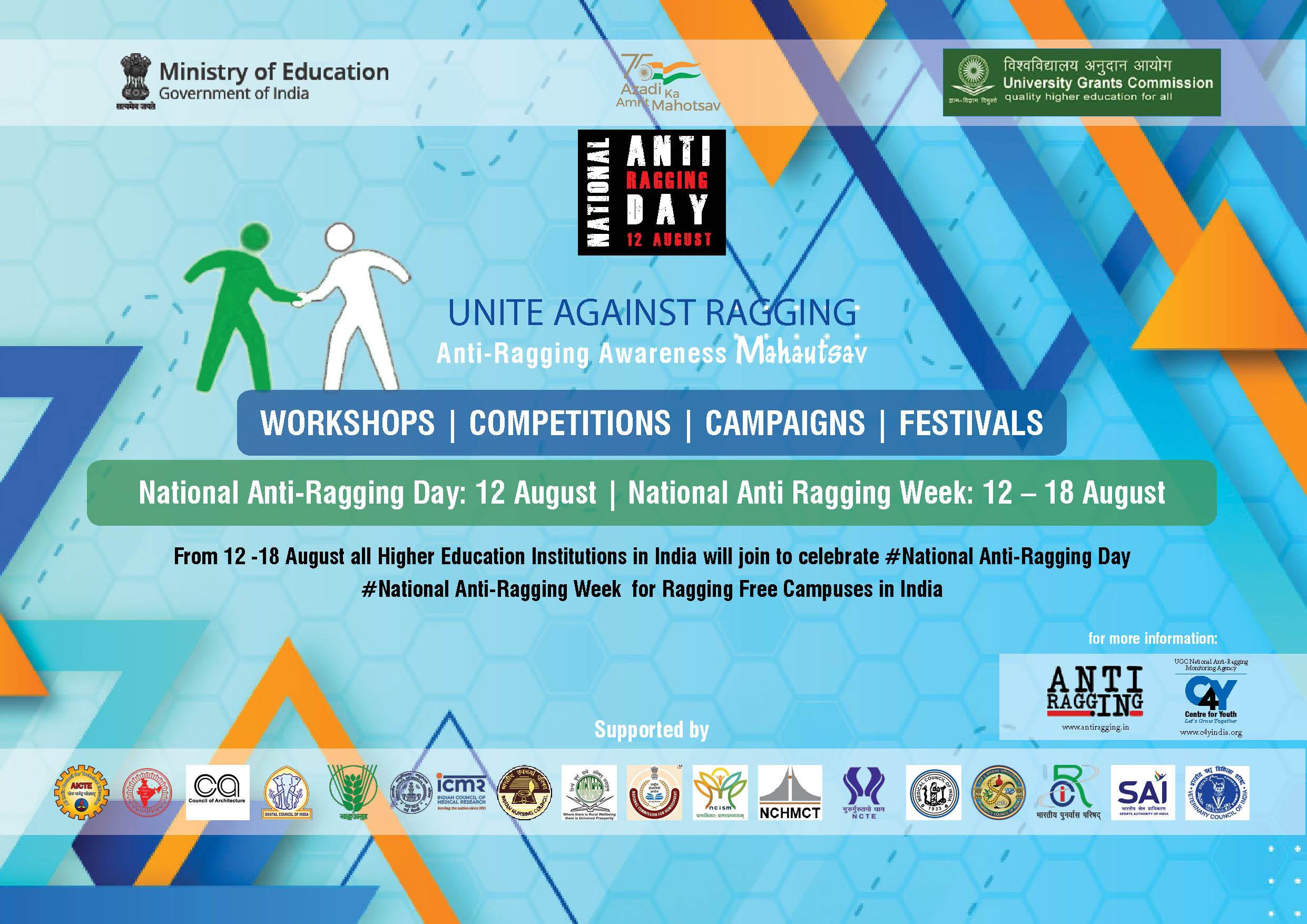 In observance of Anti-Ragging Day on 12 August, followed by Anti-Ragging Week from 12 to 18 August, the UGC and Centre for Youth (C4Y), the UGC National Anti-Ragging Monitoring Agency, suggest the following activities during these celebrations: