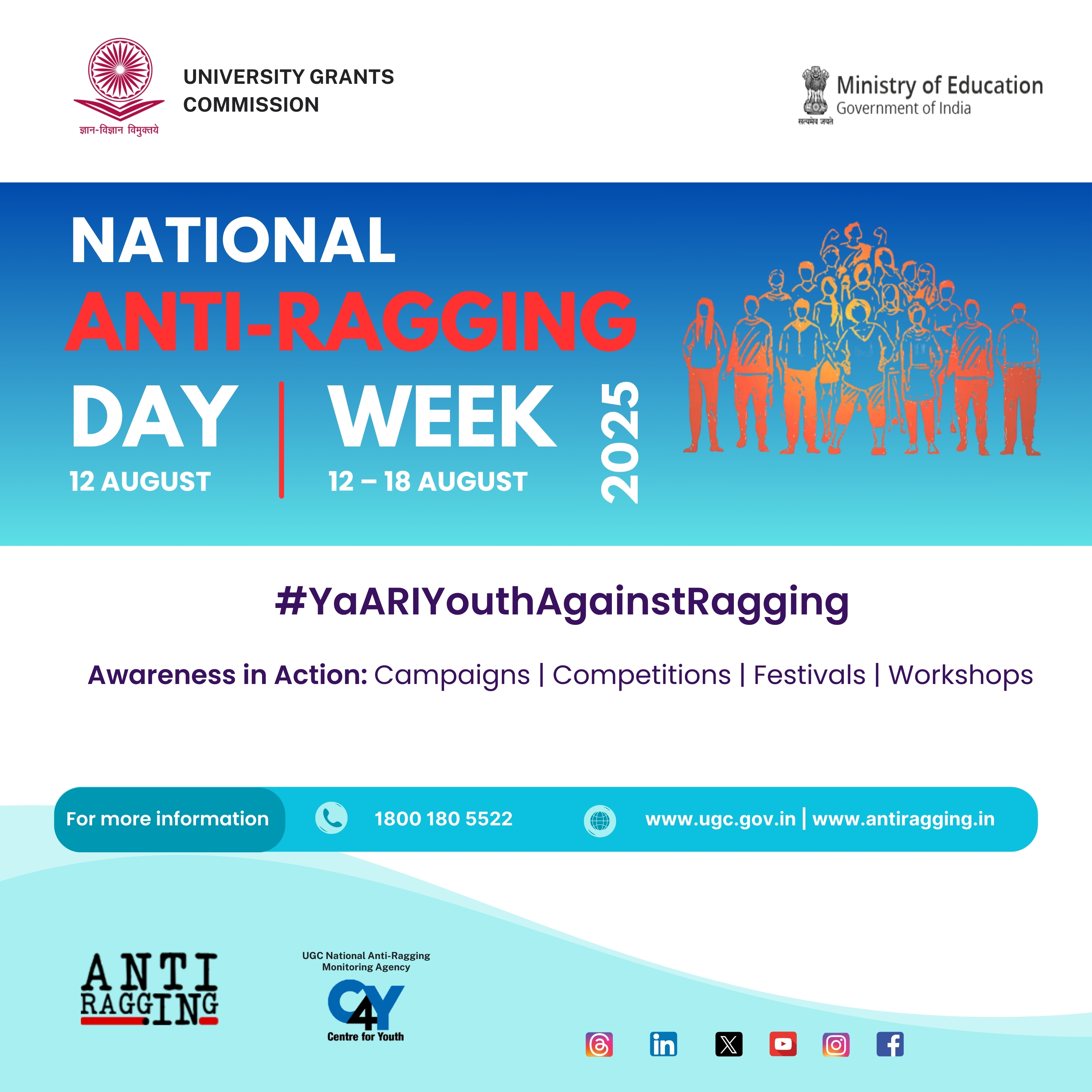 - Use the hashtag #YaARIYouthAgainstRagging in all your awareness activities and social media campaigns & posts related to celebrating Anti-Ragging Day/Week, and tag UGC and C4Y.