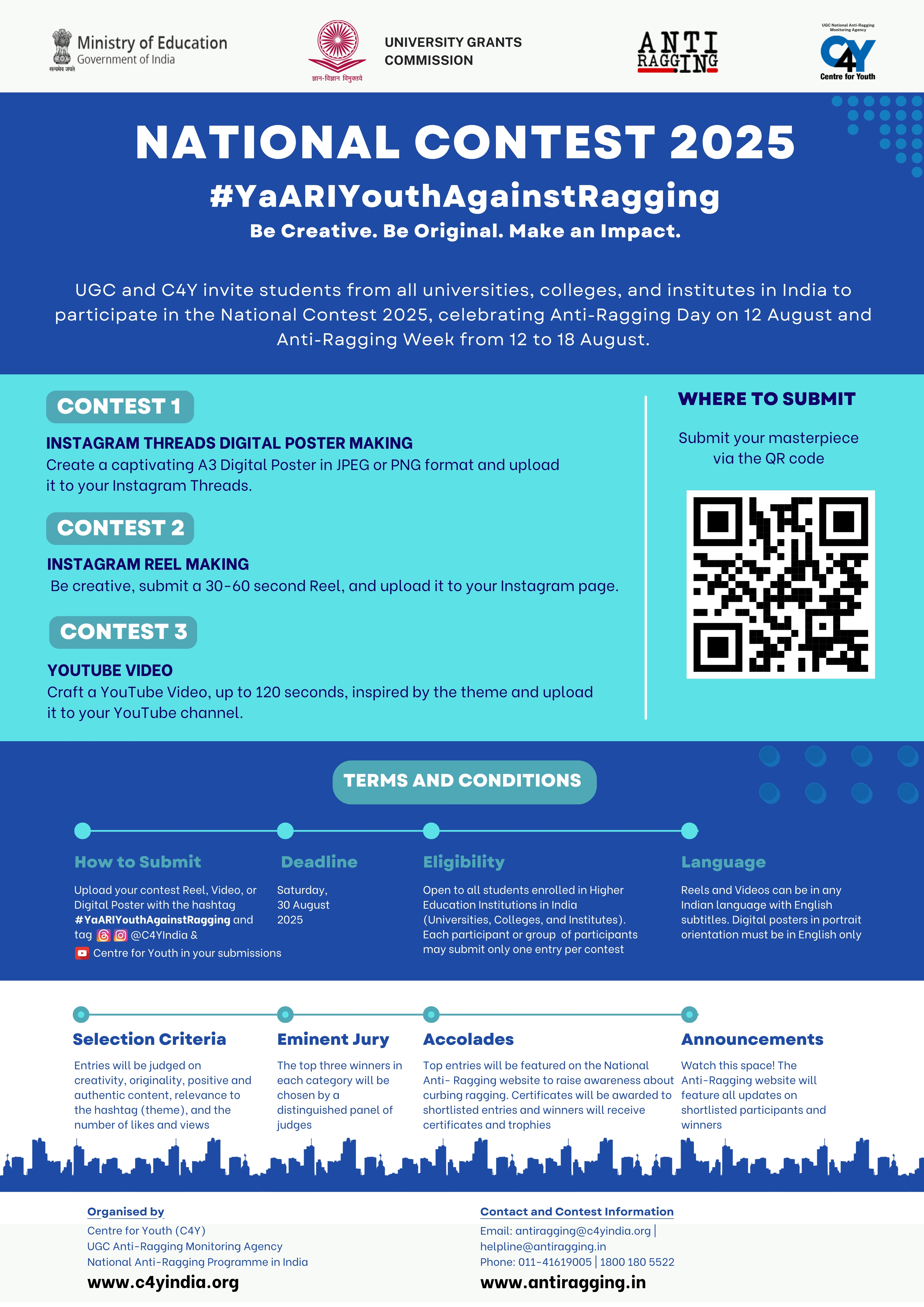 - How to Submit : Upload your contest Reel, Video, or Digital Poster with the hashtag #YaARIYouthAgainstRagging and tag @c4yindia (Instagram and Threads) & Centre for Youth (YouTube) in all your submissions